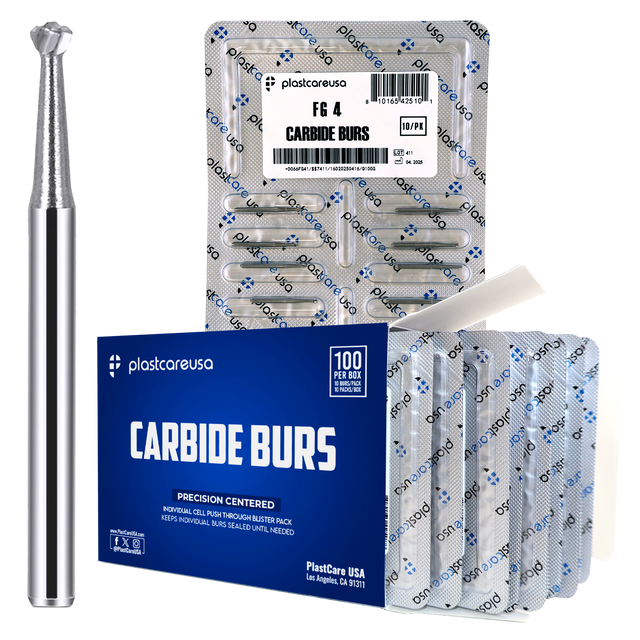 - PlastCare USA FG 4 Clinical Length Carbide Burs deliver sharp, reliable cutting for cavity prep and restorative procedures. Compatible with all high-speed handpieces, these friction grip burs ensure precision and minimal vibration. Includes 100 burs in 10 hygienic blister packs.