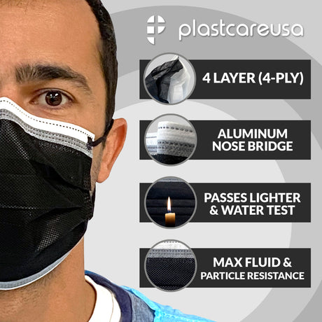 50 4-Ply ASTM Level 3 Black w/ White Stripe Surgical Masks by PlastCare USA
