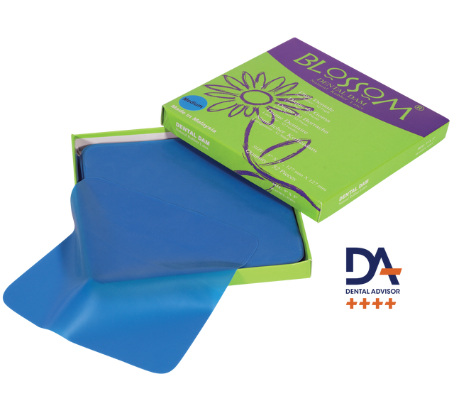 - Blossom Blue‑coded rubber dams in 5″×5″ (12.7 × 12.7 cm) sheets are crafted from premium, powder‑free natural latex with medium gauge (~0.20 mm).